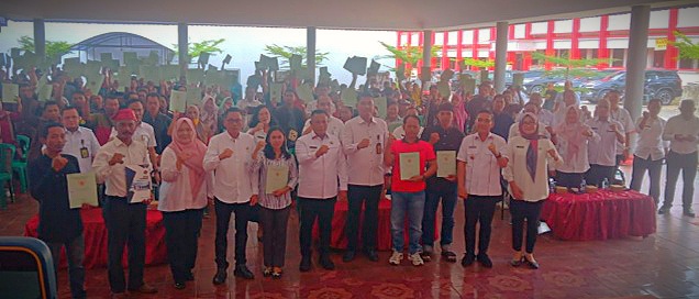 Kab.LamSel - comunitynews - Bupati Kabupaten Lampung Selatan, Nanang Ermanto, bersama ATR/BPN Lampung Selatan, meriahkan acara pembagian sertifikat tanah dari program Pendaftaran Tanah Sistematis Lengkap (PTSL) dan Redistribusi tahun 2023. Pada Rabu, 15 November 2023, Aula PKK Lampung Selatan menjadi saksi kegiatan bersejarah ini.